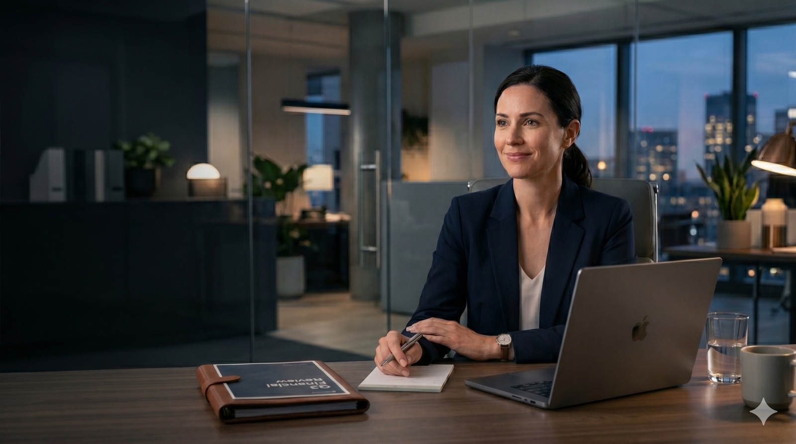 Finance professional looking calm and confident at her desk after automation has made the workday feel more manageable.